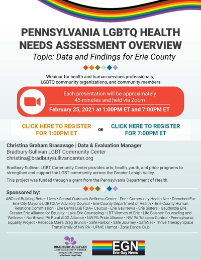 The Bradbury-Sullivan LGBT Community Center will present an overview of the 2020 Pennsylvania LGBTQ Health Needs Assessment focused on Erie. There will be two sessions, both on Thursday, February 25. The first session will be at 1 PM and primarily targets health and human services professionals, and the other session will be at 7 PM, which will mainly target community members. However, anyone is welcome to go to either or both sessions. They are both expected to last about 45 minutes. The link to register for the 1 PM session is here, and the link for the 7 PM session is here.