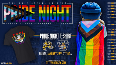 NWPA Pride is happy to partner with the Erie Otters to present our second annual Pride Night at the Erie Otters on Friday, January 28th. Doors open at 6 PM, and puck drop is at 7 PM. Tickets are only $25.00, including a ticket to the game plus an exclusive Otters Pride T-shirt.