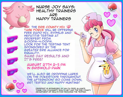 The Erie County HIV Task Force will be offering FREE rapid HIV, syphilis and Hepatitis testing at Pridefest from 2:00pm-4:00pm. Pridefest is sponsored by NW PA Pride Alliance. Look for the testing tent sponsored by the Greater Erie Alliance for Equality. Thank you Community Health Net and the Erie County Department of Health for providing the testing. SAME DAY RESULTS AND IT'S FREE!