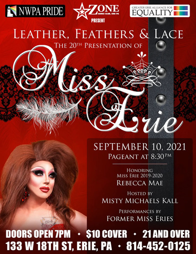 On Friday, September 10 at 8:30 PM, the Miss Erie Pageant will return to The Zone Dance Club, 133 W 18th St, Erie, PA. This year's theme is "Leather, Feathers, and Lace," and we will be honoring our current reigning Miss Erie, Rebecca Mae. The event is sponsored by NWPA Pride Alliance, Greater Erie Alliance for Equality (GEAE), and The Zone and will also include performances by former Miss Erie title holders. Do you have what it takes to be the next Miss Erie? Packets are now available! Contact Misty Michaels Kall/Joshua Smolinsky via Facebook for a packet or more information! Packets can also be picked up at The Zone.