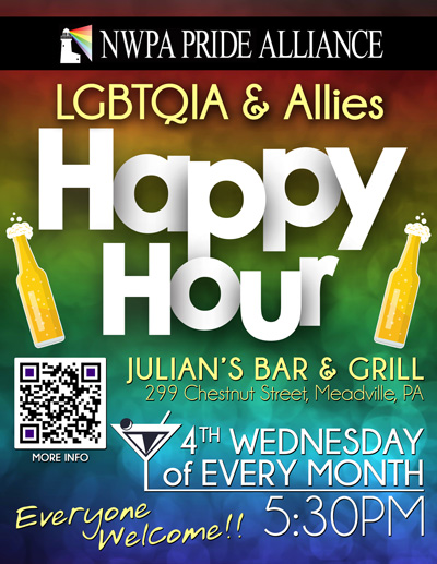 The NWPA Pride Alliance hosts a monthly LGBTQ Happy Hour on the fourth Wednesday of each month. Join us at Julian's Bar & Grill, 299 Chestnut Street in Meadville, beginning at 5:30 PM. On February 23, Julian's will feature Meadville's own '50 miles to Empty' playing from 6-9 PM. For more details, see our Facebook page or contact Brett Staskiewicz via Facebook or at (814) 720-1737. All are welcome!