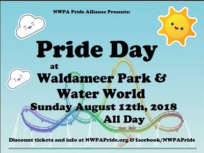 We had so much fun last year, we're doing it again! NW PA Pride Alliance will be hosting Pride Day at Waldameer Park and WaterWorld on Sunday, August 12, the day after the Pride Picnic. End your Pride Weekend with unlimited rides and slides at a discounted price! To join us: