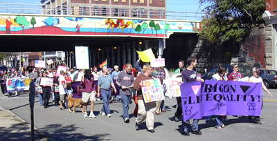 Marching down State Street during October 3 March and Rally