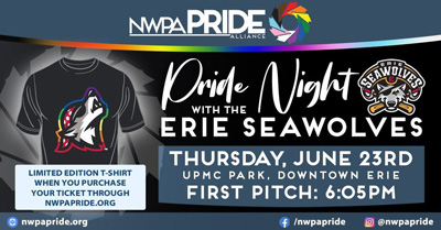 NWPA Pride is happy to announce the return of Pride Night at the Erie Seawolves on Thursday June 23rd 2022. The Seawolves will be planning the Bowie Baysocks. First pitch is at 6:05Pm from UPMC Park in downtown Erie. A special shirt and ticket package will be available when purchasing your ticket through NWPAPride.org. The ticket and shirt combo will need to be picked up from the Will Call ticket window. Shirt/ticket combos are limited purchase early to guarantee availability. In the event of weather cancelation ticket will be redeemable for any other game the remainder of the season (subject to availability).
