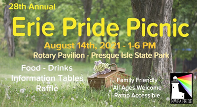 The Northwest Pennsylvania Pride Alliance, inc. would like to invite you to join us for the Erie Pride Picnic 2021 on Saturday, August 14th at the Rotary Pavilion at Presque Isle (near Beach 7) from 1 to 6 PM.