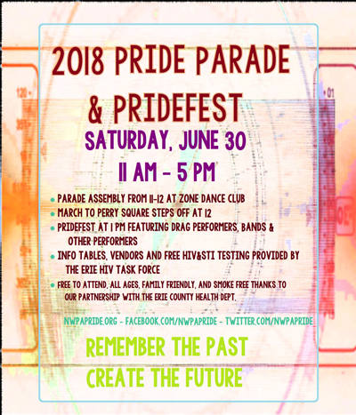 Erie Pridefest and March will take place this year on June 30th. We will gather at The Zone Dance Club on 133 West 18th Street 11AM to noon, and step off at noon to march to Perry Square